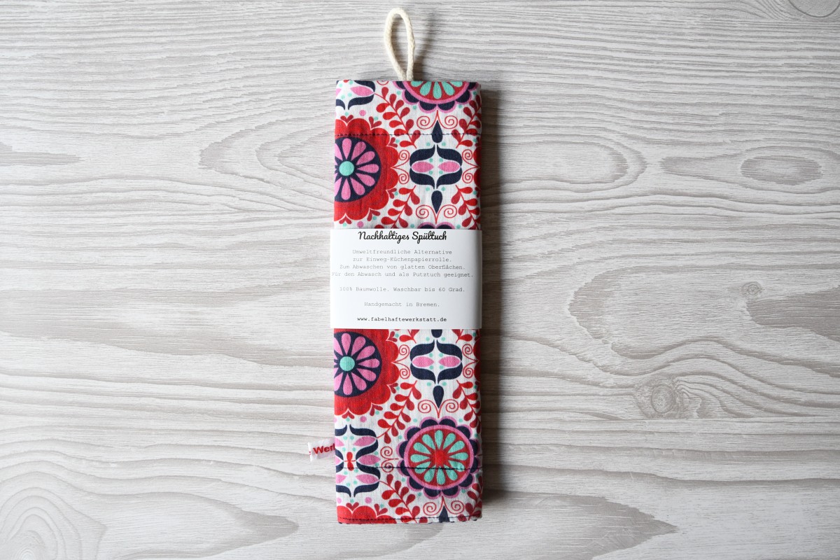 Putztuch, Spültuch aus Baumwolle - "Rote Retroblumen"