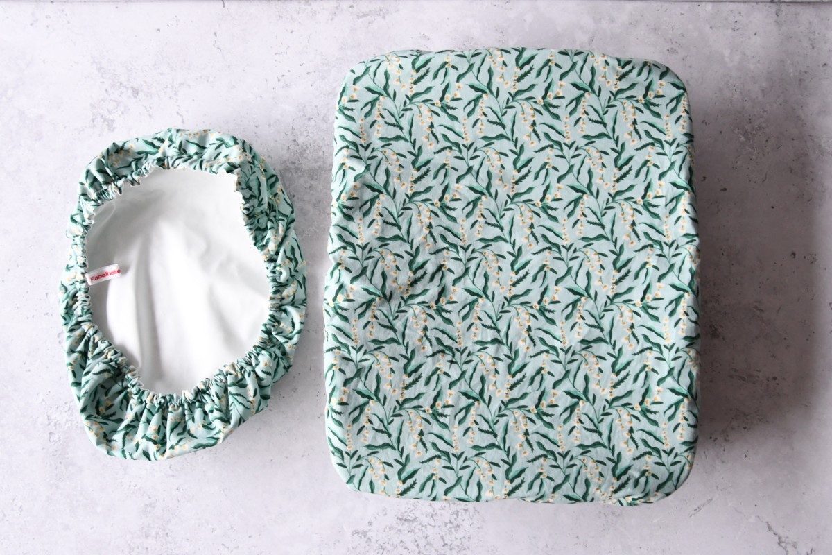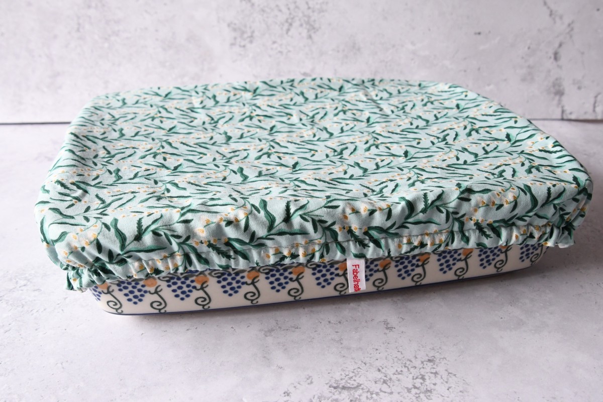 Die genähten Abdeckhauben können durch ihren dehnbaren Gummizug über alle rechteckigen Gefäße wie Auflaufformen gezogen werden. Übrig gebliebene Lebensmittel werden somit schnell abgedeckt und geschützt, ohne Alu- oder Frischhaltefolie verwenden zu müssen. Die Abdeckhauben sind selbstverständlich waschbar und kühlschranktauglich.
