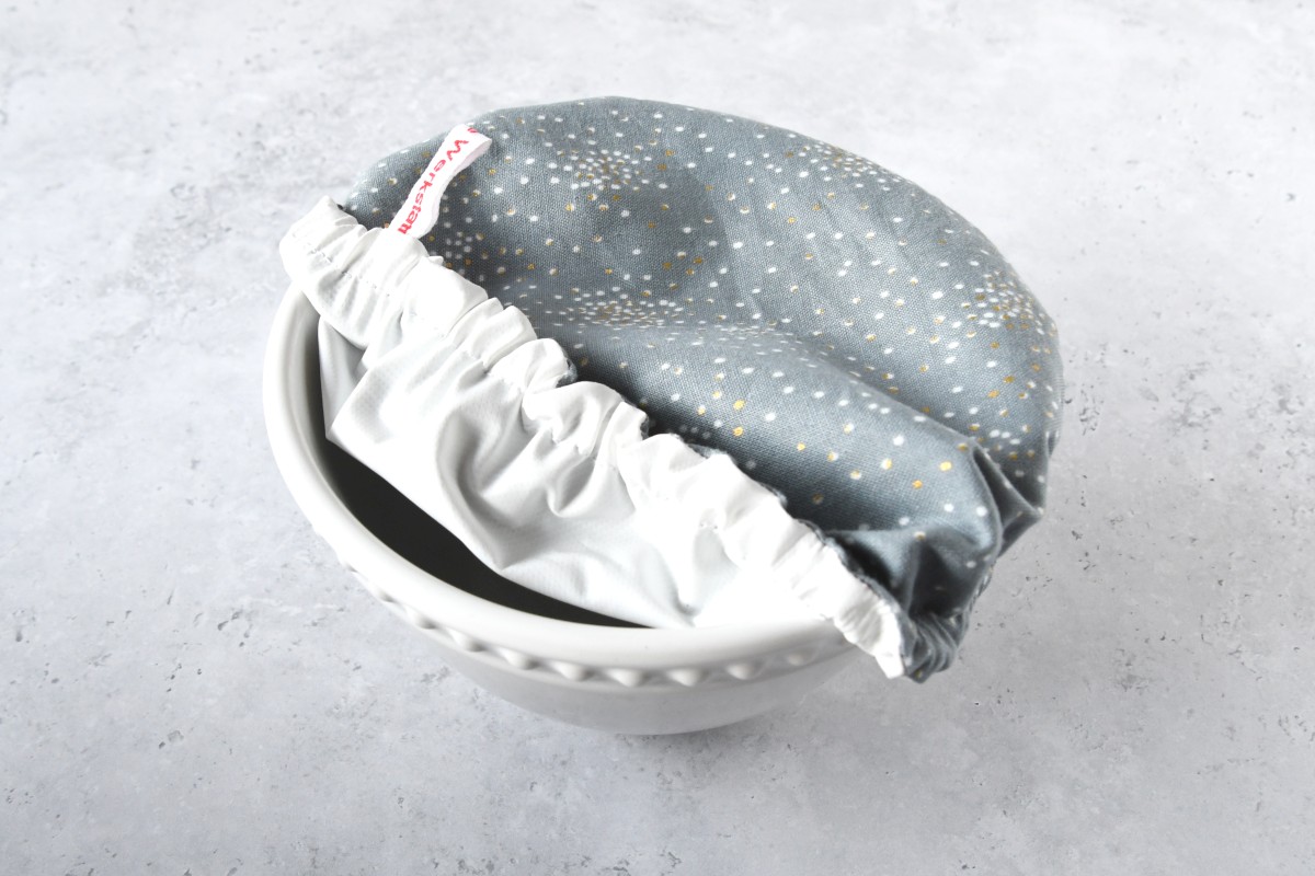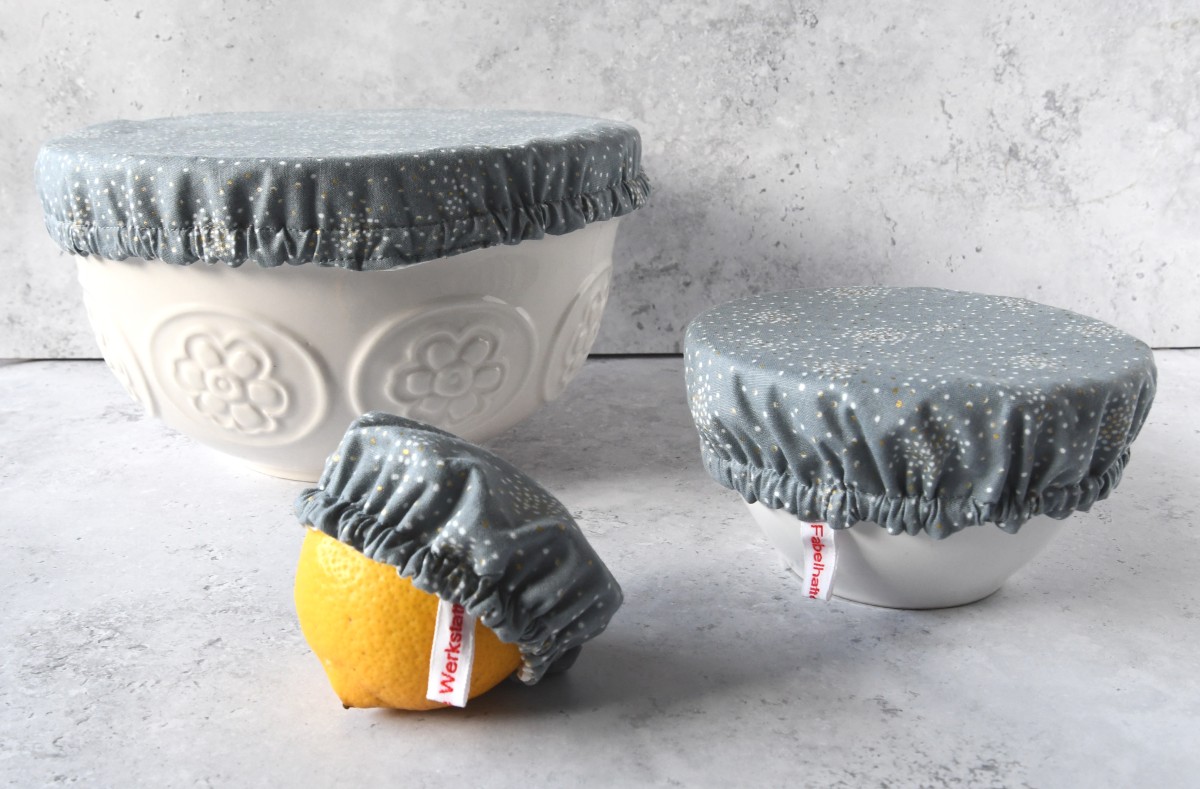 Die genähten Schüssel- bzw. Abdeckhauben können durch ihren dehnbaren Gummizug über alle runden Gefäße, Schüsseln, Töpfe und sogar über angeschnittenes Obst wie eine halbe Wassermelone gezogen werden. Übrig gebliebene Lebensmittel werden somit schnell abgedeckt und geschützt, ohne Alu- oder Frischhaltefolie verwenden zu müssen. Die Schüsselhauben sind selbstverständlich waschbar und kühlschranktauglich.
