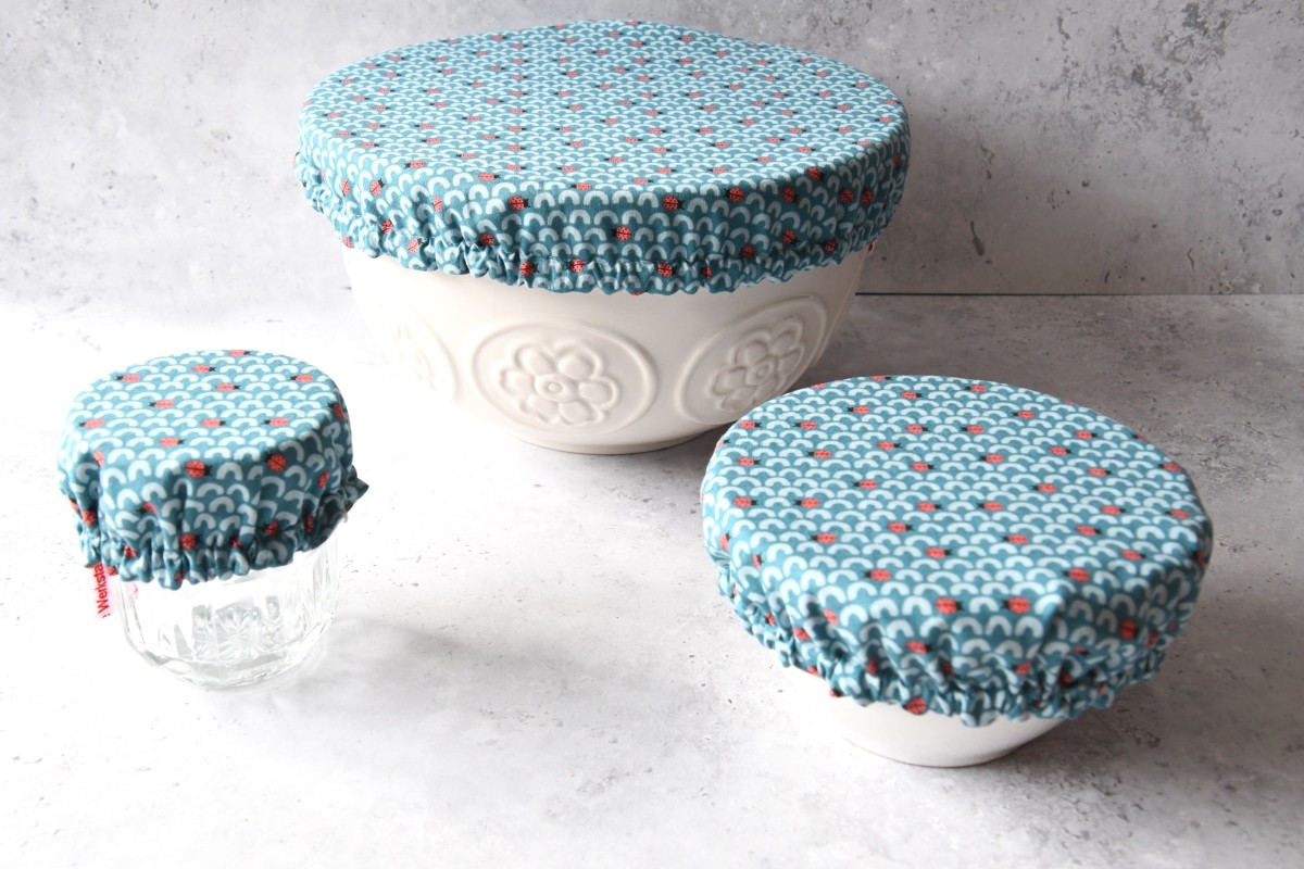Die genähten Schüssel- bzw. Abdeckhauben können durch ihren dehnbaren Gummizug über alle runden Gefäße, Schüsseln, Töpfe und sogar über angeschnittenes Obst wie eine halbe Wassermelone gezogen werden. Übrig gebliebene Lebensmittel werden somit schnell abgedeckt und geschützt, ohne Alu- oder Frischhaltefolie verwenden zu müssen. Die Schüsselhauben sind selbstverständlich waschbar und kühlschranktauglich.